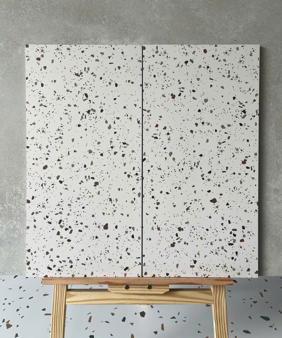 Terrazzo là phong cách thiết kế gạch đang được hồi sinh mạnh mẽ trong thiết kế nội thất hiện đại. Gạch lát nền vân đá terrazzo 60x60cm với các hạt khoáng màu ngẫu nhiên trên nền trắng, xám hoặc đen tạo hiệu ứng trẻ trung, phá cách. Đây là lựa chọn lý tưởng cho những ai muốn gạch lát nền phòng khách vừa độc đáo, vừa dễ kết hợp với đồ nội thất tối giản, mang hơi hướng Scandinavian hoặc Industrial.